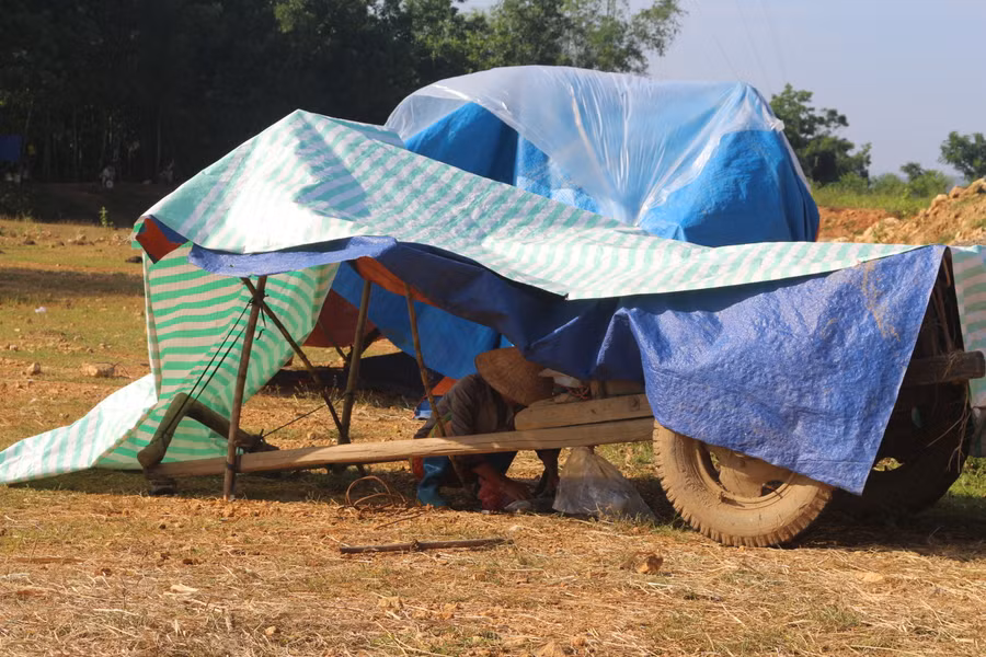 Chúng tôi về với bà con vừng lũ xã Thạch Định, huyện Thạch Thành, nơi bị thiệt hại nặng nề nhất từ cơn lũ do ảnh hưởng của trận áp thấp nhiệt đới vừa qua. Dọc trên con đê nội đồng xã Thạch Định là những mái lán dựng tạm để tránh lũ của người dân được dựng vội để có chỗ che mưa, che nắng. Bên cạnh đó, là ngổn ngang các xoong nồi cùng gà, lợn may mắn được gia đình kịp thời đưa theo để chạy lũ.