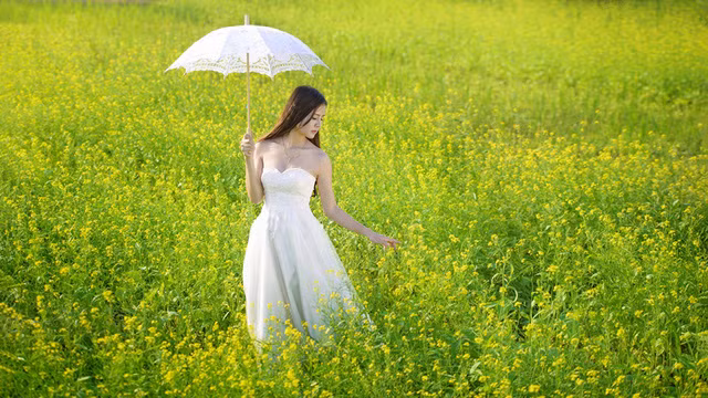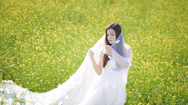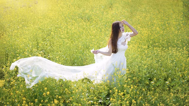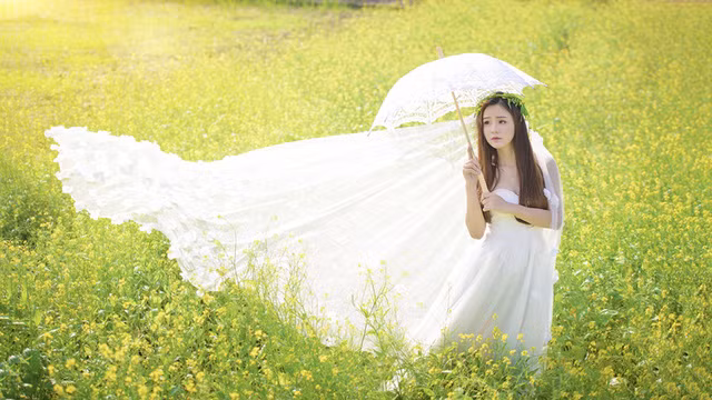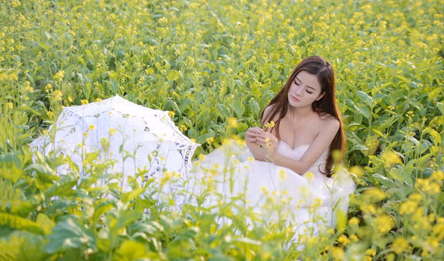 Gương mặt bầu bĩnh, cặp mắt to tròn nhưng đồng thời cũng toát lên vẻ dịu dàng, trong chiếc váy trắng tinh khôi, Thu Thủy càng trở nên mong manh, ngọt ngào.