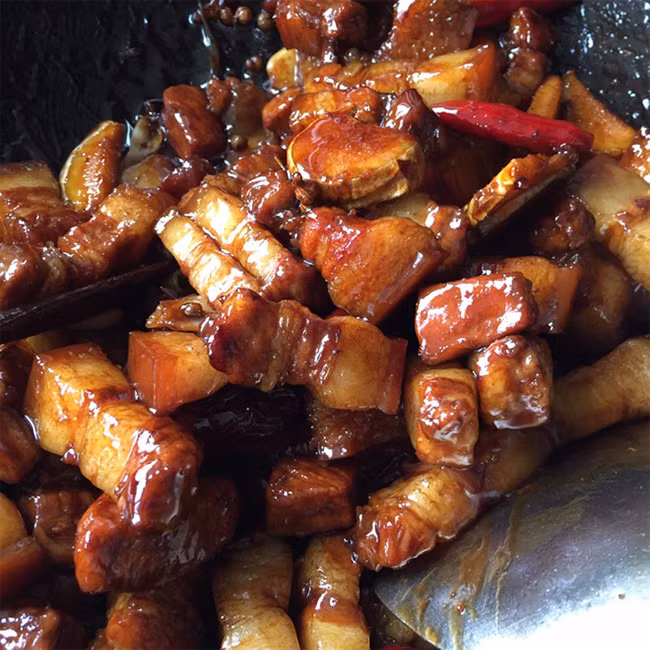 3, Làm nóng chảo với chút dầu thực vật, cho thịt đã ướp vào xào lửa nhỏ cho đến khi thịt chín khoảng 80%, nếu thịt bị khô thì có thể thêm chút dầu, tiếp tục xào đều tay. Thịt chín thì thêm chút đường trắng đảo đều, thêm nước nấu lửa nhỏ cho đến khi thịt sền sệt nước như thịt kho tàu.