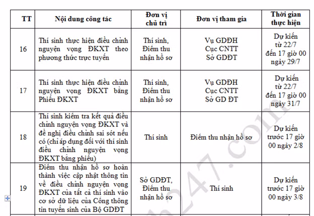 Theo lịch tuyển sinh đại học hệ chính quy, tuyển sinh cao đẳng, trung cấp nhóm ngành đào tạo giáo viên hệ chính quy năm 2019 do Bộ GD&ĐT công bố, thí sinh sẽ được điều chỉnh nguyện vọng đăng ký xét tuyển theo phương thức trực tuyến, dự kiến từ 22/7 đến 17h ngày 29/7.