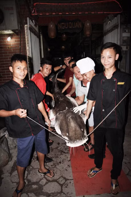 Anh Hoàng Nghĩa - Chủ nhà hàng ở Cầu Giấy - cho hay: Sau khi nhận được thông tin một ngư dân Campuchia đánh bắt được con cá lăng "siêu khủng" ở khu vực sông Mê Kông, anh đã lập tức liên hệ để mua bằng được.