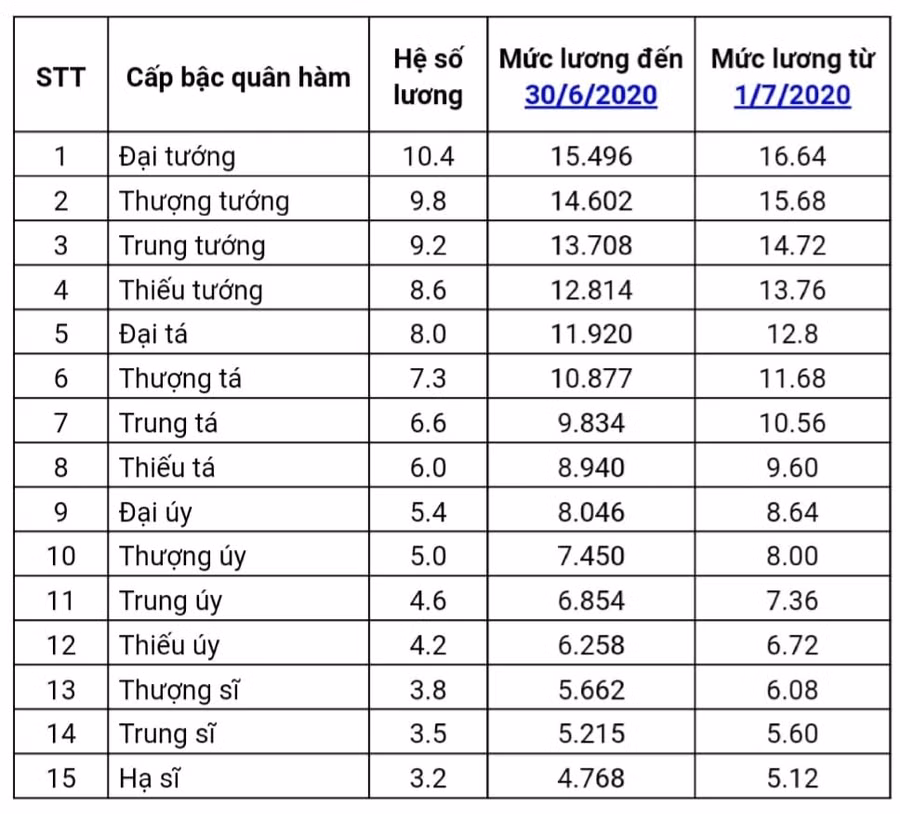 Bảng lương sỹ quan quân đội và sỹ quan công an dự kiến tăng vào 1/7