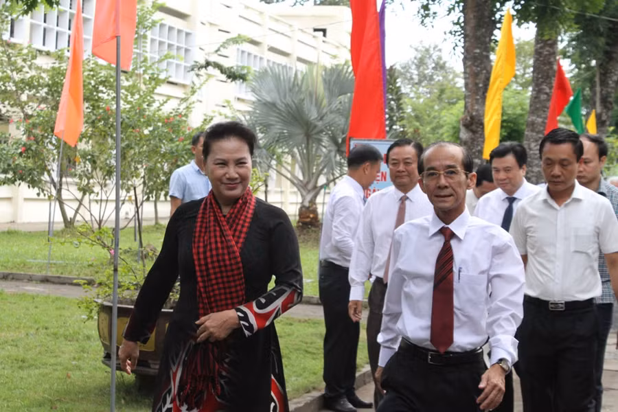Trong không khí náo nức, thầy trò Trường THPT Tháp Mười, huyện Tháp Mười (Đồng Tháp) rất vui mừng chào đón Chủ tịch Quốc hội Nguyễn Thị Kim Ngân dẫn đầu đoàn công tác của Quốc hội đến chúc mừng và chung vui trong lễ khai giảng.