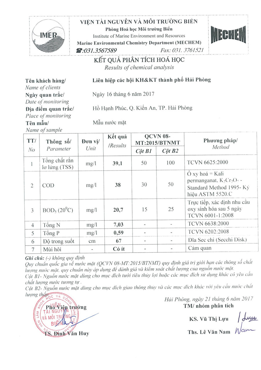 | Kết quả phân tích hoá học tại hồ Hạnh Phúc (Hải Phòng) đều cho kết quả trong tiêu chuẩn |