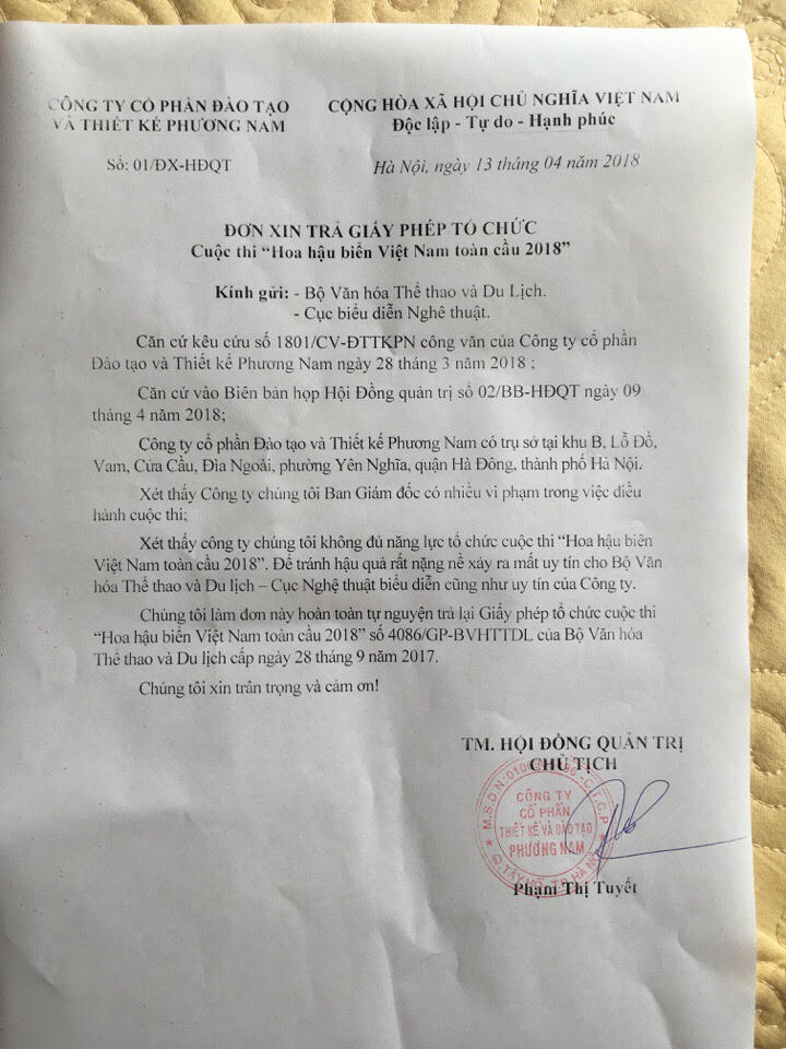 “Đồng thời trong buổi làm việc này, tôi và các cổ đông của công ty tôi tha thiết đề nghị trả lại giấy phép tổ chức cuộc thi Hoa hậu biển Việt Nam toàn cầu 2018 được Bộ VH-TT&DL cấp cho công ty Phương Nam để tổ chức”, bà Tuyết nói.
