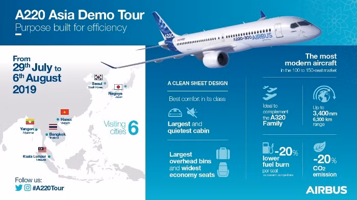 Sáng nay (29/7), đại diện của Airbus cho biết, chiếc máy bay bay Airbus A220-300 sẽ thực hiện tour trình diễn tại Châu Á. Trong hành trình này, A220-300 sẽ dừng chân tại 6 địa điểm trong hành trình bay trình diễn tại khu vực châu Á.