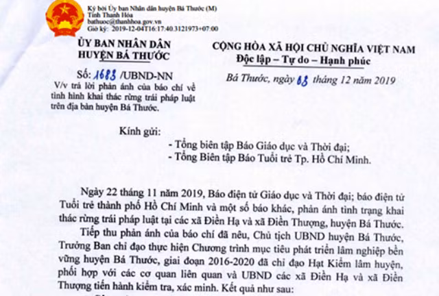 Theo công văn của UBND huyện Bá Thước, nêu: “Ngày 22/11/ 2019, Báo GD&TĐ, phản ánh tình trạng khai thác rừng trái pháp luật tại các xã Điền Hạ và xã Điền Thượng, huyện Bá Thước.