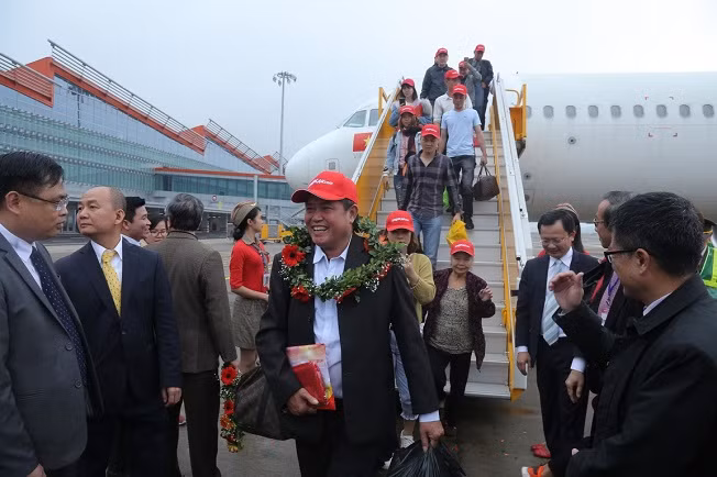 Máy bay A321 mang số hiệu VJ230 chở 180 hành khách khởi hành từ sân bay Tân Sơn Nhất lúc 9 giờ 10 và hạ cánh tại sân bay Vân Đồn lúc 11 giờ 25 cùng ngày. Sau nghi thức phun vòi rồng và múa lân chào đón, lãnh đạo UBND Tỉnh Quảng Ninh, TP Hạ Long, huyện Vân Đồn đã trao những vòng hoa tươi thắm cho phi hành đoàn và những vị khách đầu tiên.