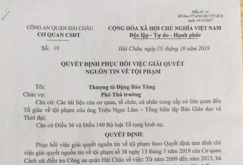 Quyết định Phục hồi việc giải quyết nguồn tin về tội phạm số 10, ngày 28/10/2019 do Thượng tá Đặng Bảo Tùng- Phó thủ trưởng Cơ quan CSĐT Công an quận Hải Châu, TP. Đà Nẵng ký nêu rõ là Phục hồi việc giải quyết nguồn tin về tội phạm theo QĐ tạm đình chỉ việc giải quyết nguồn tin về tội phạm số 38 ngày 13/5/2019 của Cơ quan CSĐT Công an quận Hải Châu.