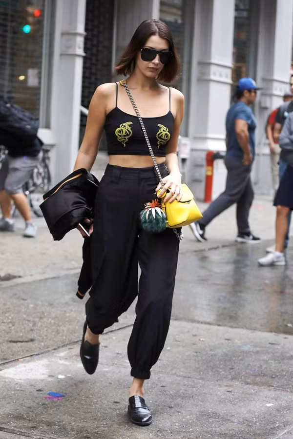 Trong khi đó, em gái Gigi, Bella Hadid vẫn chuộng phong cách gợi cảm với áo 2 dây lửng, quần vải bó gấu, bomber jacket. Set đồ tông đen mang lại nét khỏe khoắn cho cô nàng.