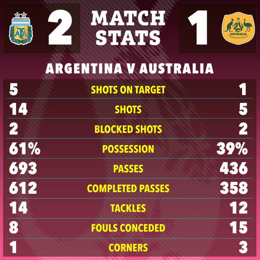 Đại diện Nam Mỹ đã thực hiện tổng cộng 693 đường chuyền so với 436 đường chuyền của đối thủ. Số đường chuyền chính xác của Argentina cũng cao hơn nhiều so với Úc khi lần lượt là 612 và 358.