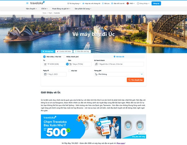 Nếu quan tâm đến vé máy bay đi Úc, quý khách hãy liên hệ Traveloka – đại lý chính thức của hơn 200 hãng hàng không khác nhau. Không chỉ đóng vai trò là một kênh thông tin chính xác, Traveloka còn sở hữu hệ thống đặt vé máy bay thông minh, tiện lợi giúp hành khách có thể dễ dàng tra cứu và so sánh giá vé. Từ đó, chọn lựa chuyến bay phù hợp nhất với chuyến đi của mình. Chúc bạn sẽ sớm mua được những chiếc vé máy bay đi Úc giá rẻ và có một chuyến đi thật ý nghĩa bên gia đình và bạn bè nhé!