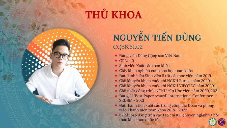 | Nguyễn Tiến Dũng còn có thành tích học khủng khi đạt điểm học tập trung bình chung toàn khóa là 4.0/4.0 |