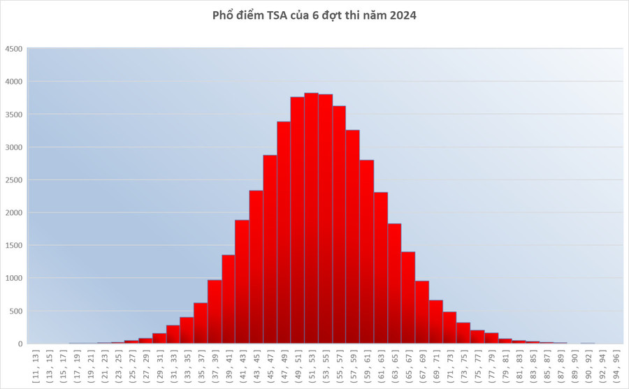 Đợt 6 có 3.688 thí sinh tham dự, thủ khoa đợt 6 là học sinh Trường THPT Kim Sơn A – Ninh Bình với điểm số 86.58. Đợt 6 có điểm trung bình là 52,75 và với phổ điểm đợt 6 TSA 2024 như sau: