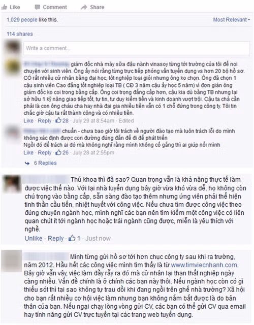 “Các bạn đừng mãi bám vào mác thủ khoa hay “kén cá chọn canh”. Theo mình, hiện nay có rất nhiều bạn có bằng đại học nhưng ngại làm trái ngành, trong khi ngay từ đầu đã chọn học một ngành không hề dễ kiếm việc” - Một Facebooker bình luận.