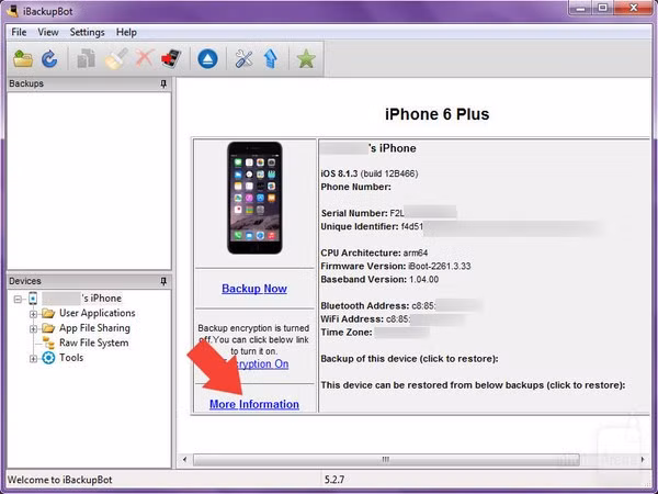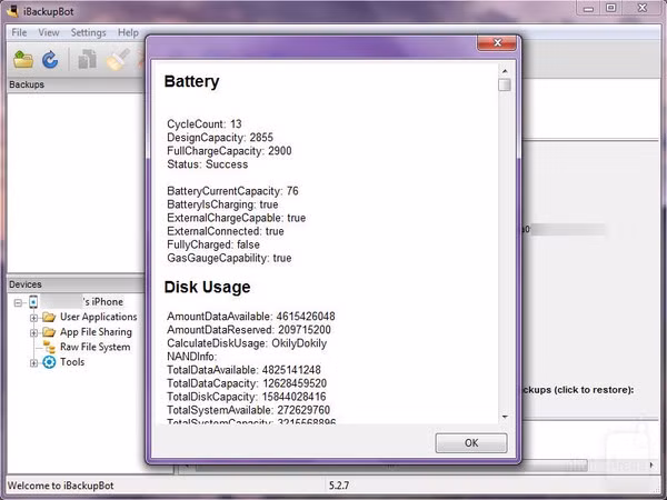 để lấy thông tin về pin của chiếc iPhone của bạn. Sau khi cài đặt ứng dụng này và kết nối iPhone với máy tính, iBackupBot sẽ cho phép bạn truy xuất các thông tin chi tiết về thiết bị của mình. Bằng cách click vào More Information, người dùng có thể thấy được một số thông tin như số chi trình sạc máy đã trải qua hay khả năng thực tế của viên pin. Tại đây, nếu bạn thấy chỉ số FullChargeCapacity thấy hơn nhiều so với chỉ số DesignCapacity, đây là lúc pin bắt đầu hoạt động kém ổn định đi khá nhiều. (Pin lithium thường mất 20% dung lượng sau 500 chu trình sạc).