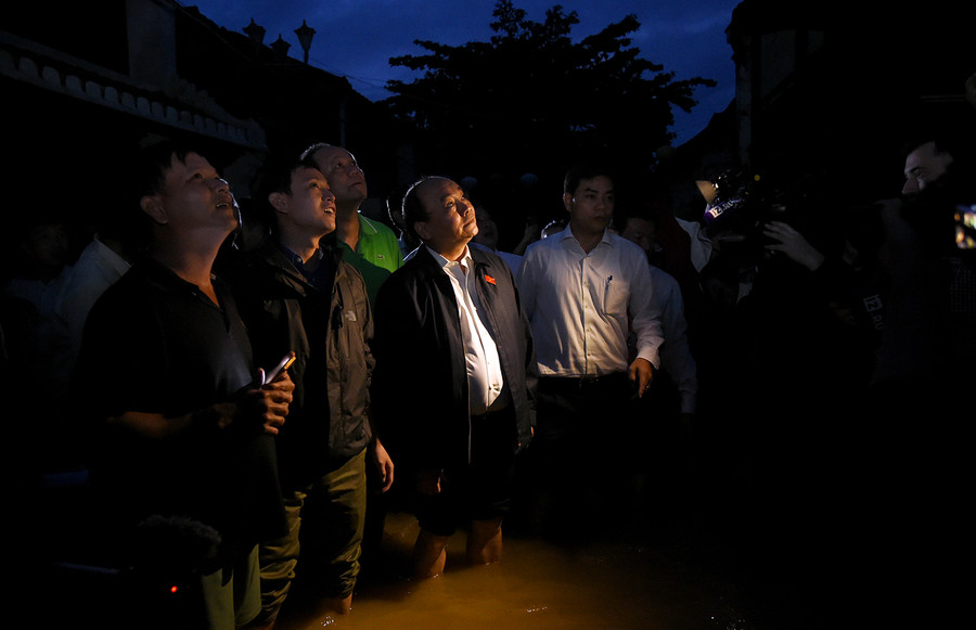 Thủ tướng Nguyễn Xuân Phúc lội nước, đi bộ dọc phố cổ Hội An hỏi thăm, động viên người dân nỗ lực khắc phục vệ sinh, dọn dẹp nhà cửa, sớm ổn định cuộc sống và chỉ đạo chính quyền tỉnh Quảng Nam tập trung khẩn trương khắc phục hậu quả mũa lũ đến đón Tuần lễ Cấp cao APEC 2017.