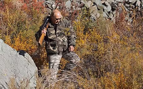 Những bức ảnh thể hiện Thủ tướng Nga đang cưỡi ngựa đi qua một vùng phong cảnh. Ông mặc bộ quần áo ngụy trang, đeo kính râm và vác trên vai khẩu súng trường.