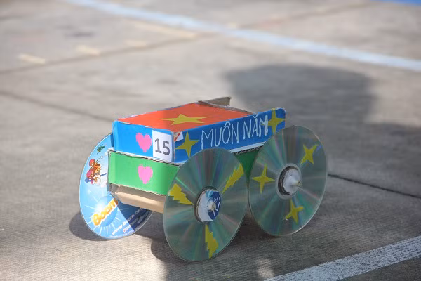 Theo nhóm, ban đầu để làm ra chiếc xe vừa đẹp về hình thức và đảm bảo xe di chuyển được xa các em đã thử các vật liệu như gỗ, băng keo, lon sữa… nhưng đưa ra thử nghiệm thì vẫn không đạt được kết quả như mong muốn và sau đó các em đã dùng đĩa CD để làm bánh xe mới cho ra kết quả ưng ý.