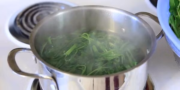 Trong quá trình luộc luôn để nước ngập rau như thế rau muống vừa giòn lại vừa xanh hơn.