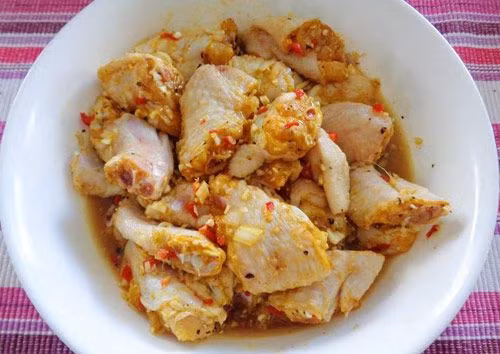 Gà ta mua về rửa sạch, để cho gà ráo nước rồi chặt miếng vừa ăn. Nêm nếm thêm một chút gia vị rồi ướp khoảng 10 - 15 phút để gà thêm đậm đà.