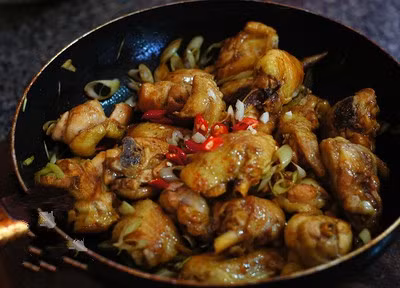 Gà chín, trút ra đĩa đã đặt sẵn giấy thấm dầu rồi gạn bớt phần dầu thừa trong chảo.