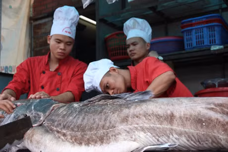 Sáng 7/11, chủ nhà hàng đã làm thịt cá lăng hoa phục vụ khách.