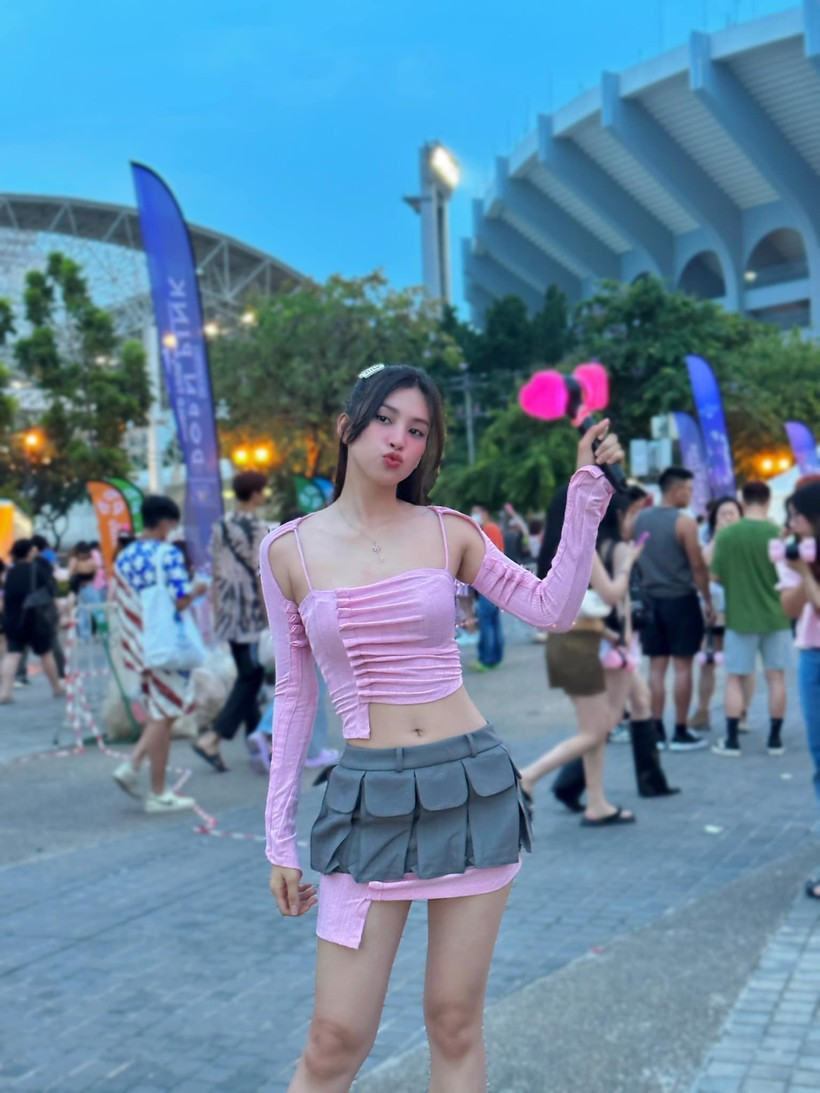 | Hoa hậu Thùy Tiên trang điểm nhẹ nhàng nhưng không kém phần quyến rũ, nổi bật khi đi xem concert của BLACKPINK. |