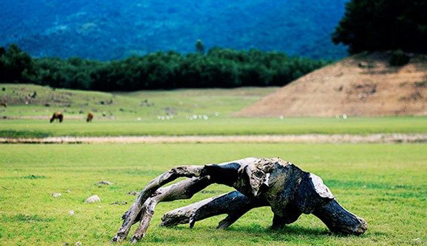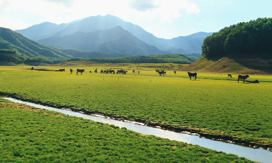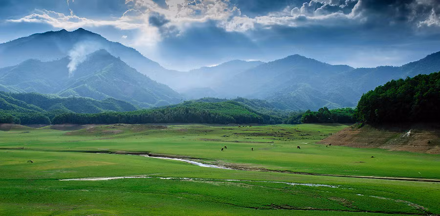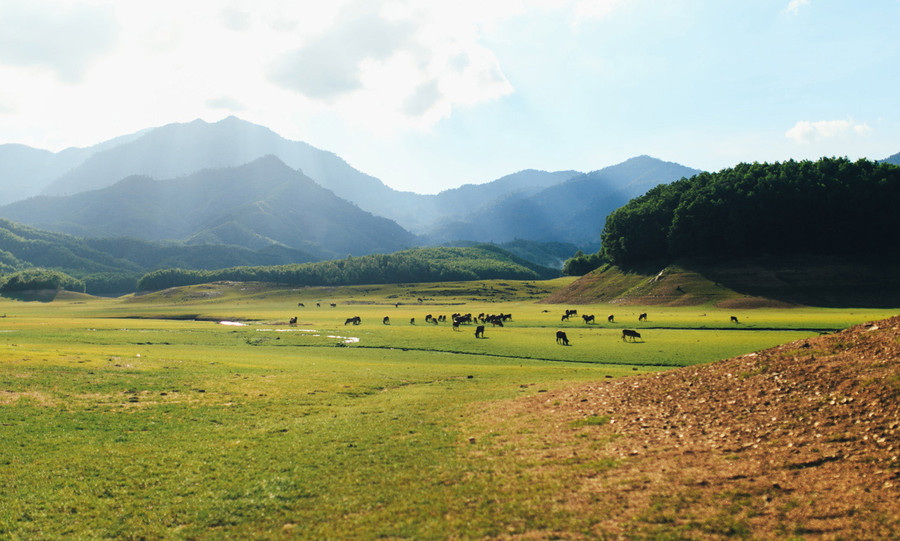 Những ngày gió thổi nhẹ, mặt nước hồ lăn tăn sóng gợn. Làn nước mát trong dưới ánh nắng mặt trời. Thỉnh thoảng, trên nền trời trong xanh xuất hiện một đàn cò trắng bay dập dìu rồi đậu xuống trên những triền cỏ tìm mồi. Tuy nhiên, vẻ đẹp yên bình ở hồ Hòa Trung không chỉ là đồng cỏ nhìn ngút mắt, mà còn là hình ảnh những đàn bò, đàn trâu nhẩn nha ăn cỏ mỗi sáng, mỗi chiều.