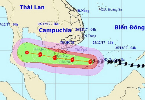 Dự báo trong 24 giờ tới, bão di chuyển chủ yếu theo hướng Tây, tốc độ di chuyển nhanh (25km/h), khoảng tối và đêm nay (25/12) bão sẽ đi vào đất liền các tỉnh từ Bà Rịa - Vũng Tàu đến Cà Mau với sức gió mạnh nhất cấp 9-10, giật cấp 12-13.