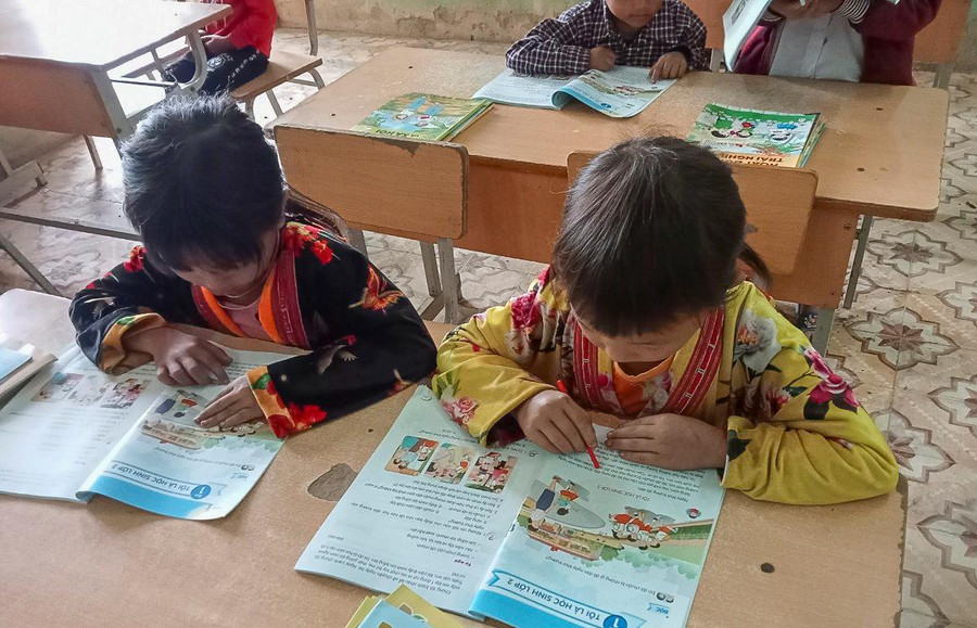 Sau màn chào cờ trang nghiêm, từ lớp học loang lổ nằm lọt thỏm giữa thung lũng đá xám Trung Vàng Khổ vang lên tiếng đọc vanh vách của học sinh người Mông, xua tan không khí ảm đạm những ngày mưa rừng rả rích…. (Trang 6)