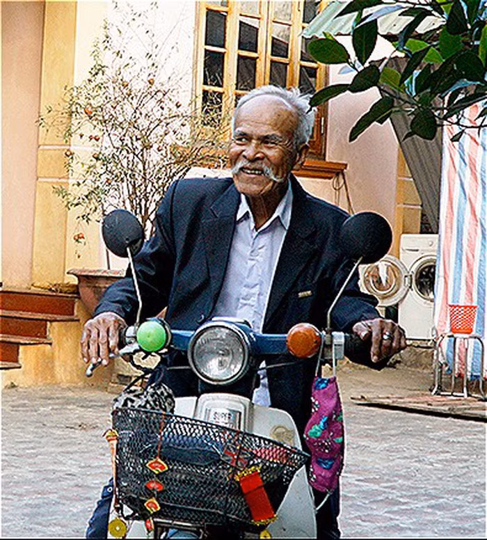 Chải lại hàng ria mép cho ngay ngắn, ông lên chiếc xe cub đi đón vợ, không quên nói đùa, ""già thì nuôi cái râu cho nó khang trang, không người ta cười"". Tiếng pô xe cũ kỹ tràn ngập âm thanh vui vẻ.