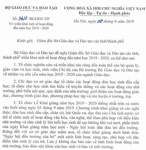 Về tổ chức lễ khai giảng năm học 2019-2020, Bộ GD&ĐT cho biết tổ chức thống nhất trên cả nước vào buổi sáng ngày 5/9/2019. Chương trình khai giảng có các nghi thức: đón học sinh đầu cấp, chào cờ, hát Quốc ca, đọc thư của Chủ tịch nước; có thể tổ chức một số hoạt động văn hóa, văn nghệ, thể thao phù hợp với điều kiện nhà trường và tâm sinh lý lứa tuổi học sinh để tạo không khí vui tươi, phấn khởi của ngày Khai giảng năm học mới - Ngày hội toàn dân đưa trẻ đến trường.