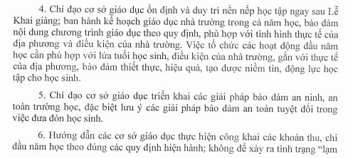 Chỉ đạo cơ sở giáo dục ổn định và duy trì nền nếp học tập ngay sau Lễ Khai giảng; ban hành kế hoạch giáo dục nhà trường trong cả năm học, bảo đảm nội dung chương trình giáo dục theo quy định, phù hợp với tình hình thực tế của địa phương và điều kiện của nhà trường. Việc tổ chức các hoạt động đầu năm học cần phù hợp với lứa tuổi học sinh, điều kiện của nhà trường, gắn với thực tế của địa phương, bảo đảm thiết thực, hiệu quả, tạo được niềm tin, động lực học tập cho học sinh.