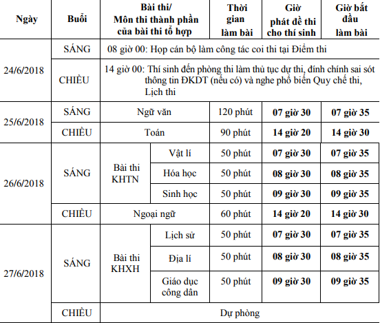 Theo đó, thời gian tổ chức thi THPT quốc gia năm 2018 sẽ diễn ra từ 24/6/2018 đến 27/6/2018. Cụ thể, ngày 24/6 thí sinh làm thủ tục dự thi và bắt đầu làm bài thi từ 25/6.