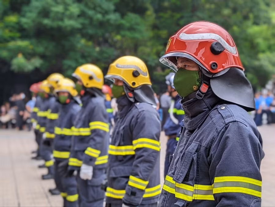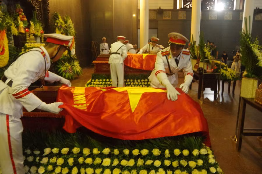 Nghi lễ phủ cờ lên áo quan các liệt sĩ được đội danh dự tiến hành trang nghiêm với sự có mặt của lãnh đạo Công an Hà Nội, các đơn vị, gia đình, người thân, đồng đội các liệt sĩ: thượng tá Đặng Anh Quân, thượng úy Đỗ Đức Việt và hạ sĩ Nguyễn Đình Phúc.