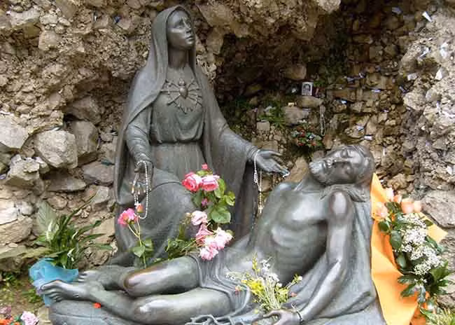 Họ chứng kiến Đức Mẹ Đồng Trinh Maria đang thẫn nhờ nhìn đứa con là Giê su không còn sức sống ở trong hang nơi mà sau này được xây dựng thành ngôi đền.