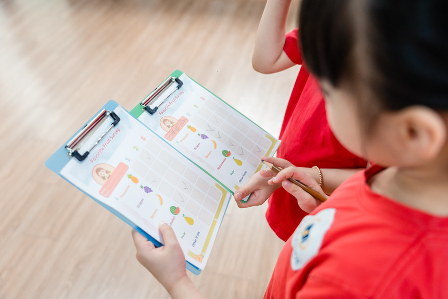 Nhiệm vụ đặt ra cho mỗi học sinh là hỏi ít nhất 3 bạn về loại quả yêu thích nhất và thống kê vào phiếu khảo sát dựa trên câu trả lời của từng bạn. Qua đó, trẻ học được rằng, mỗi người có một sở thích khác nhau, từ đó hiểu và tôn trọng sự khác biệt.