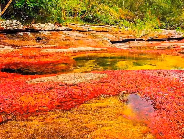 Cano Cristales nổi tiếng không chỉ bởi cảnh quan thơ mộng hai bên bờ mà còn vì màu nước vô cùng sống động. Nó là nơi hòa quyện đầy ngoạn mục của 5 sắc màu: Đỏ, vàng, ngọc bích, xanh dương và màu đen