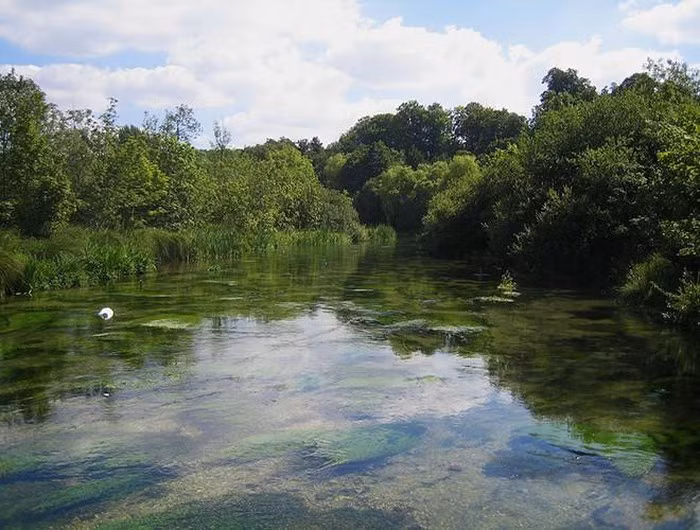 Nước sông Itchen trong veo, ánh màu xanh lơ hòa trộn với màu vàng hoặc nâu, theo các sắc độ của đá dưới lòng sông.