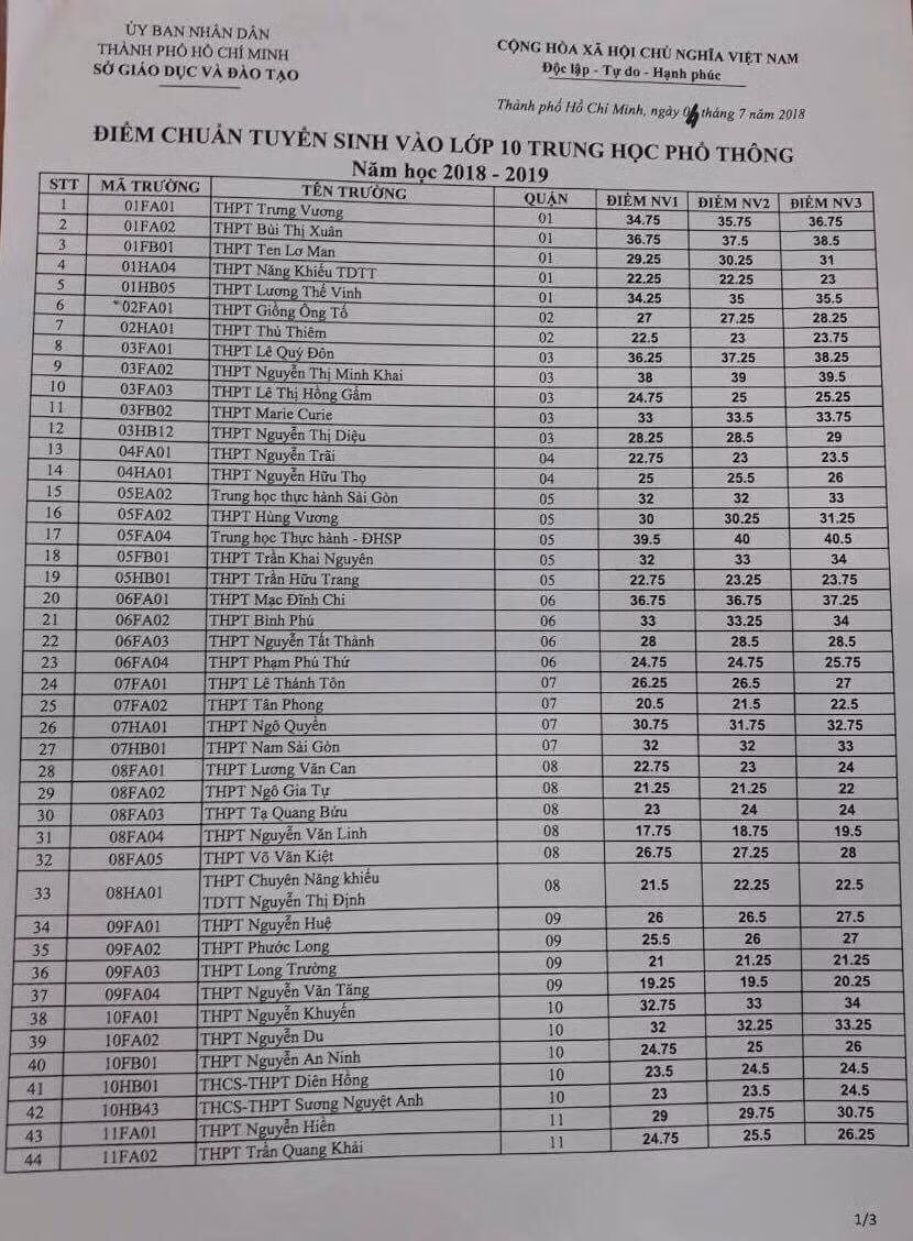 Trường có NV cao nhất là THPT Nguyễn Thượng Hiền, quận Tân Bình với 41 điểm NV1.