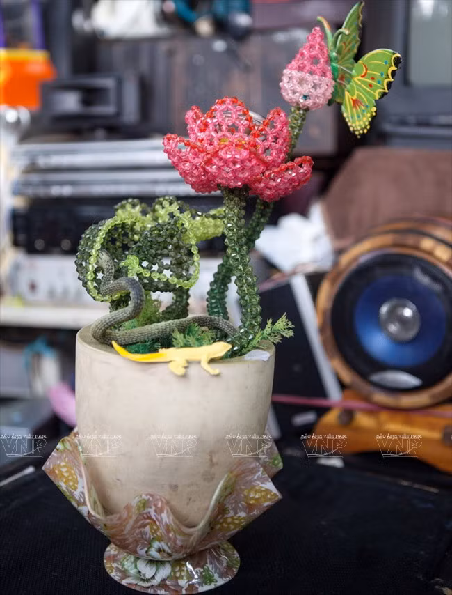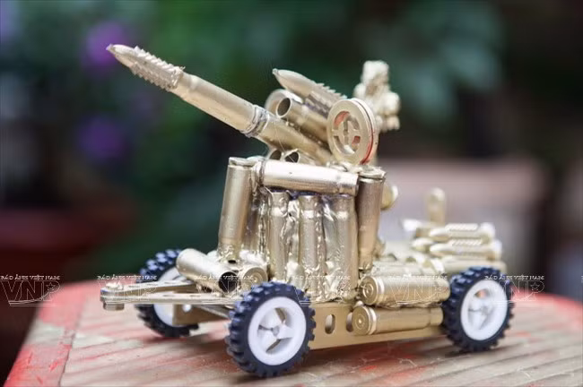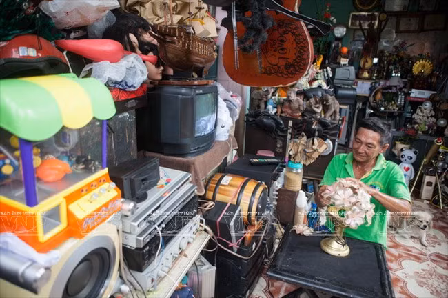 Cái nào không thể sửa được nữa, ông “biến hóa” chúng thành những món đồ chơi, đồ lưu niệm rất ngộ nghĩnh, trưng bày khắp căn nhà nhỏ. Con robot, mô hình xe tăng, môtô, chiếc đàn, lọ cắm hoa… đều được ông tái chế lại từ nhiều đồ vật khác nhau.
