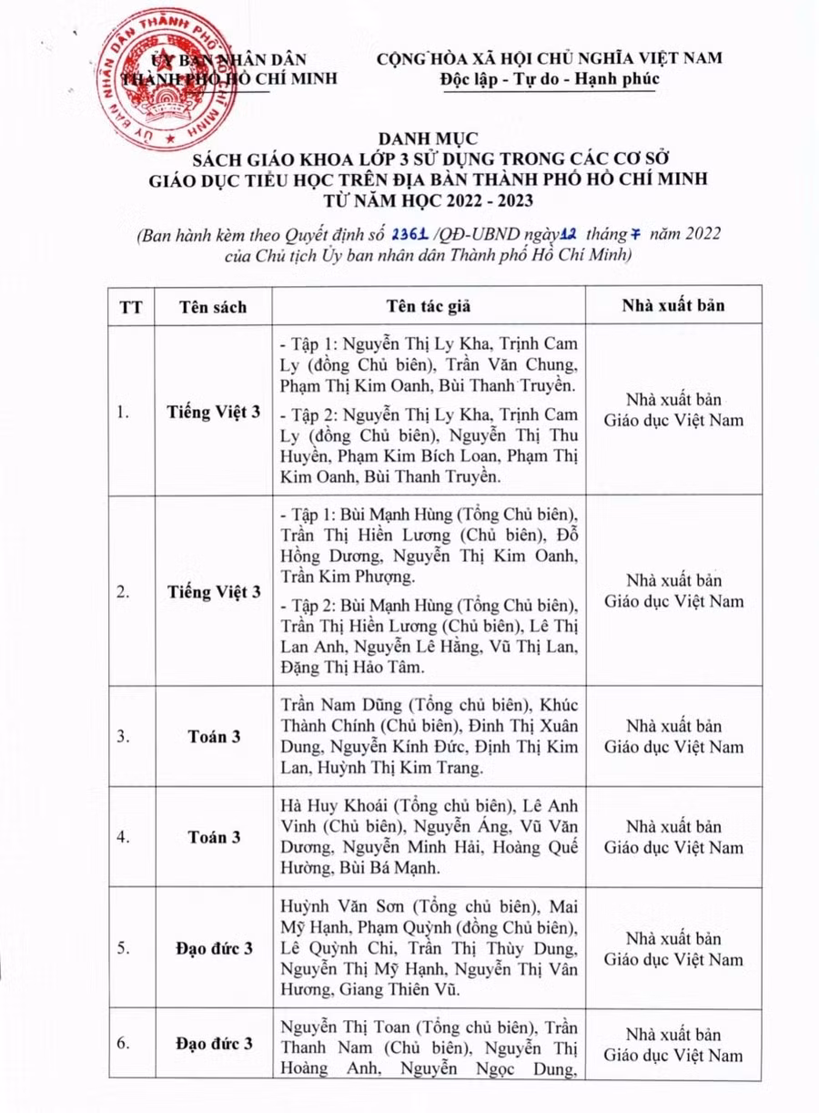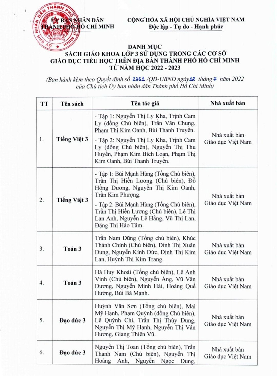 | Danh mục sách giáo khoa lớp 3 sử dụng từ năm học 2022-2023 tại TPHCM. |
