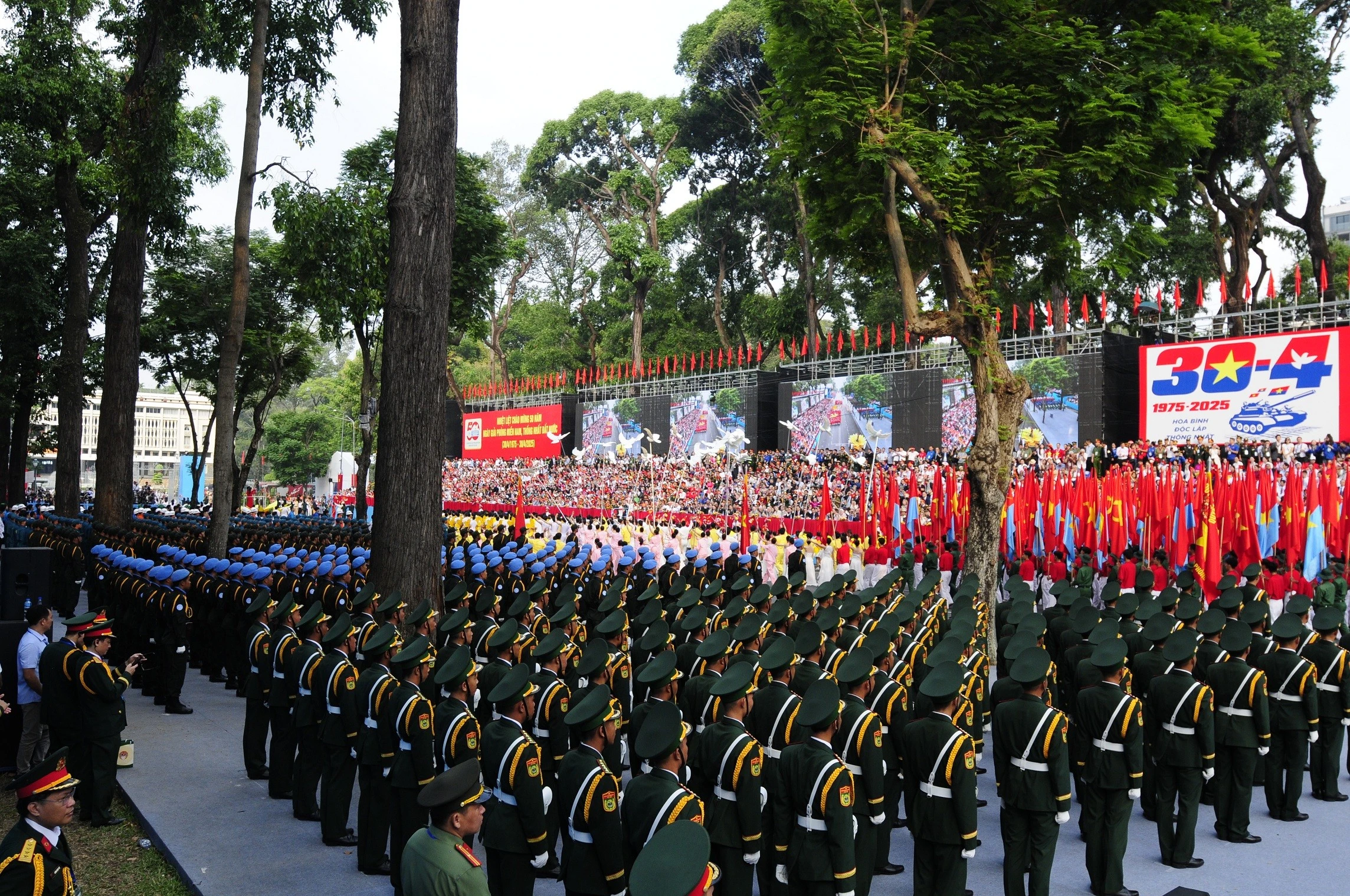 Sau khi hoàn thành phần nghi thức trang trọng tại khán đài chính trên đường Lê Duẩn, các khối diễu binh, diễu hành tiếp tục qua phố đi bộ Nguyễn Huệ rồi tiến ra bến Bạch Đằng trong sự chào đón nồng nhiệt của hàng nghìn người dân.