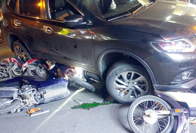 Tại hiện trường, 3 xe máy nằm dưới gầm xe, hư hỏng nhẹ, tài xế ô tô đã dùng khăn, bao bì, che lại biển số. Người dân cho hay, tài xế xe ô tô chạy xe với biểu hiện không tỉnh táo.