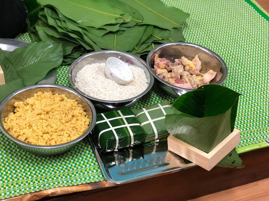 Cô và trò cùng tất bật chuẩn bị những chiếc lá dong được rửa sạch sẽ, lau khô, khuôn gói bánh và những nguyên liệu cần thiết như: Gạo nếp, lá dong, đỗ xanh và thịt lợn trong sự hứng khởi, vui vẻ ...