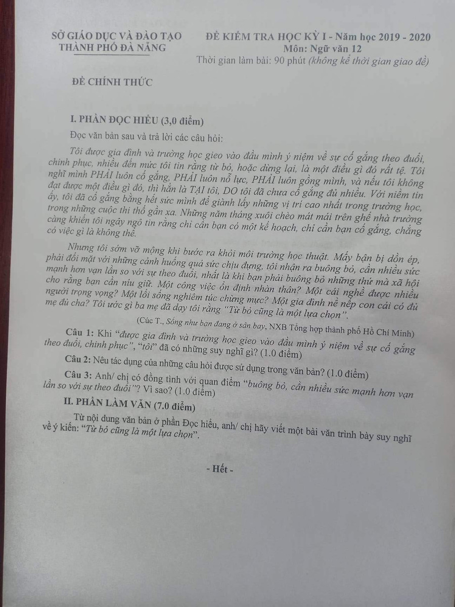 Đề kiểm tra môn Ngữ Văn học kỳ I, lớp 12 của Sở GD&ĐT Đà Nẵng cụ thể như sau: