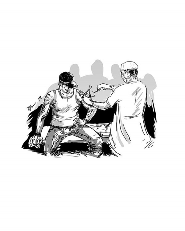 Và để gặp được bác sỹ này nếu không có bệnh, hoặc không được giới giang hồ giới thiệu thì khó như lên trời. Phải viện tới Chu Văn Cường - 31 tuổi tức “Cường Kiến”, đệ tử số một của Huy Rambo – dân giang hồ có tiếng một thủa của Hà Nội mới bị đâm chết ở hội chợ Yên Mỹ, Hưng Yên năm 2013 - làm kẻ dẫn đường, tôi mới tiếp cận được bác sỹ ở Long Biên, vị bác sỹ giấu mặt mà giới giang hồ vẫn đồn đại.