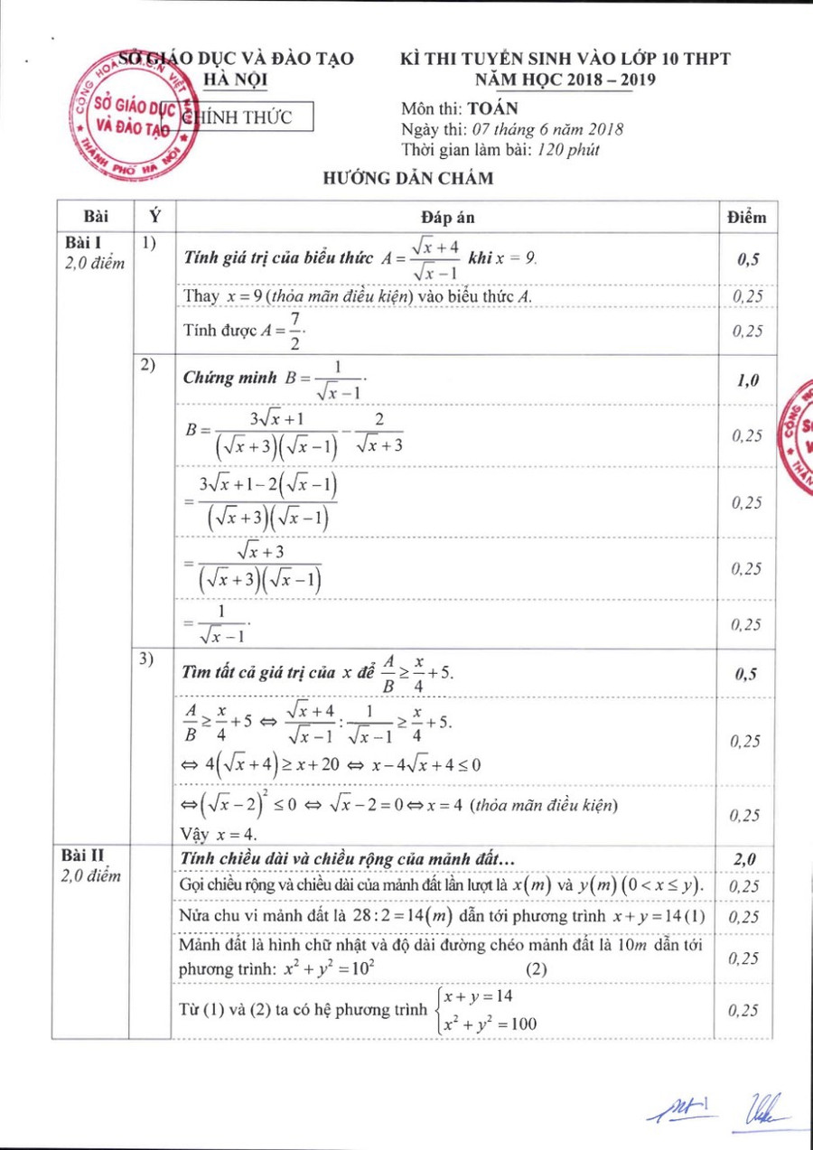 GD&TĐ - Sở GD&ĐT Hà Nội vừa công bố đáp án chính thức môn Toán kỳ thi tuyển sinh lớp 10 THPT năm học 2018 - 2019.