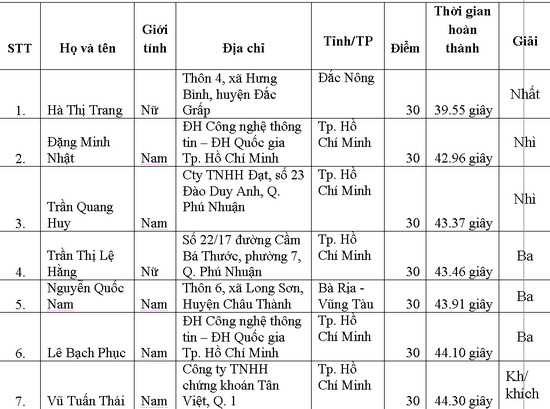 Tại lễ trao giải, Ban tổ chức sẽ trao 1 giải Nhất, hai giải Nhì, ba giải Ba và 10 khuyến khích cho các thí sinh. Được biết thí sinh đạt giải Nhất là Hà Thị Trang (Thôn 4, xã Hưng Bình, huyện Đắc Grấp, Đắc Nông) với số điểm tuyệt đối là 30 và thời gian hoàn thành bài dự thi là 39.55 giây.